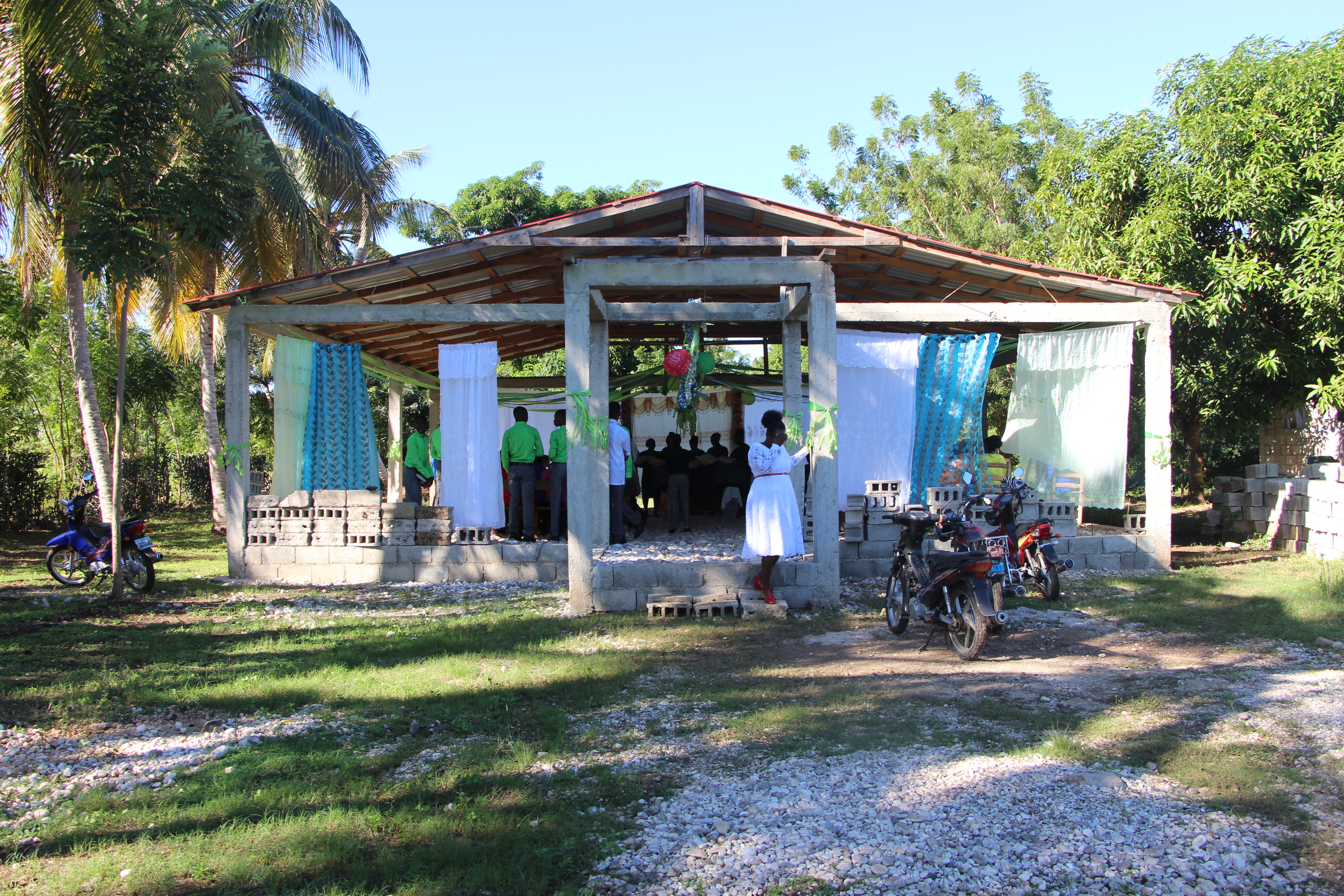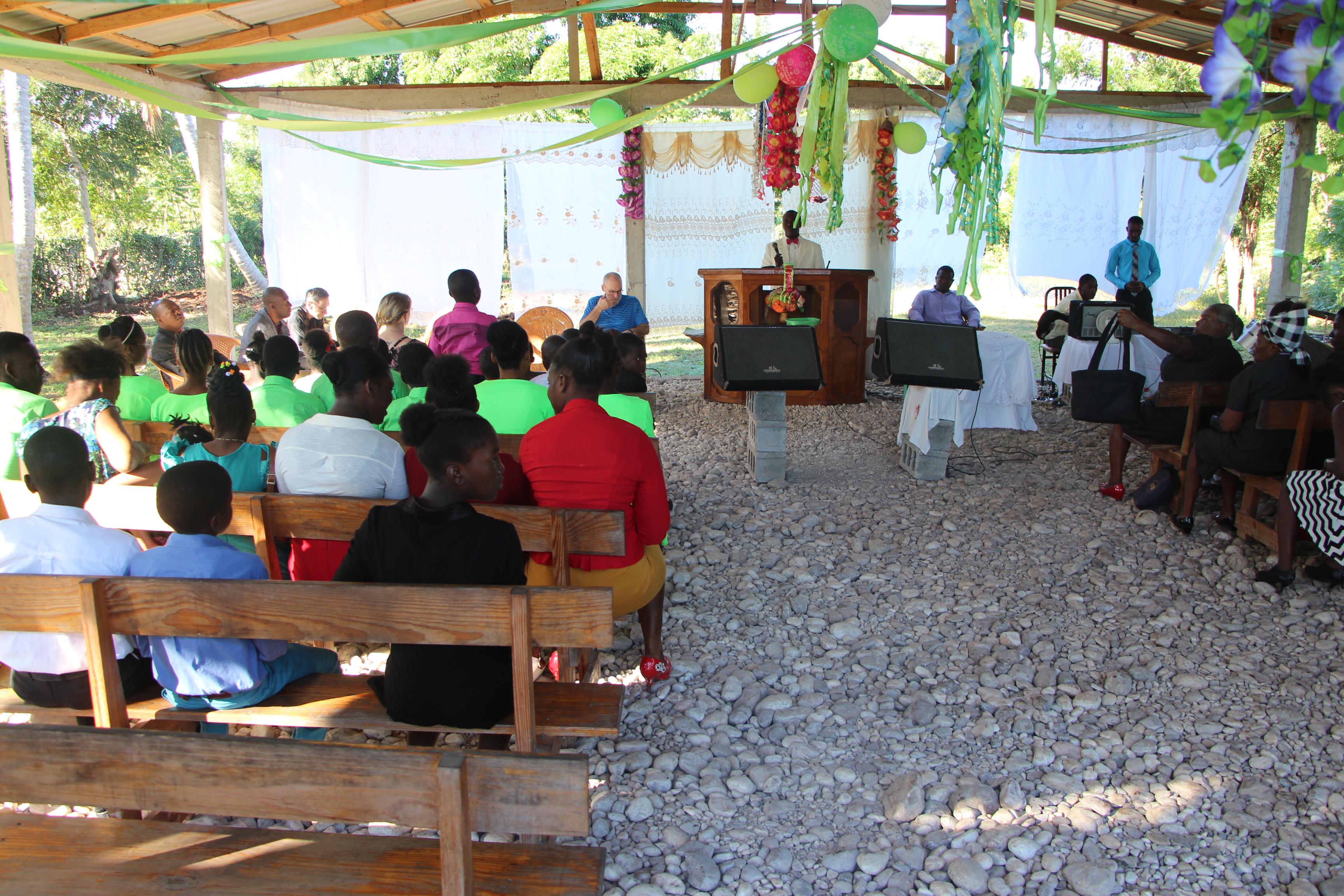 In the morning, they had breakfast ready for us. We then went to worship which started at 8am. The church is just 18 months old, but have about 75 in attendance already. The building is really just a shelter, with a metal roof, no walls and a loose rock floor. The culture is to dress up for church. Perhaps the biggest miracle of the morning was that no woman sporting spiked high heels did not roll an ankle. We would like to help them with a cement floor. They have raised $300 for this already. Pastor Marc committed to matching any funds which they raise towards this project. Estimated cost is about $2000. US. If you would like to support this new church plant with a decent flooring surface; so they can dance like true Haitian Worship, we would be happy to pass on your donation.